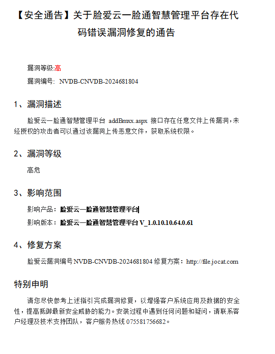 【安全通告】關于臉愛云一臉通智慧管理平臺存在代碼錯誤漏洞修復的通告